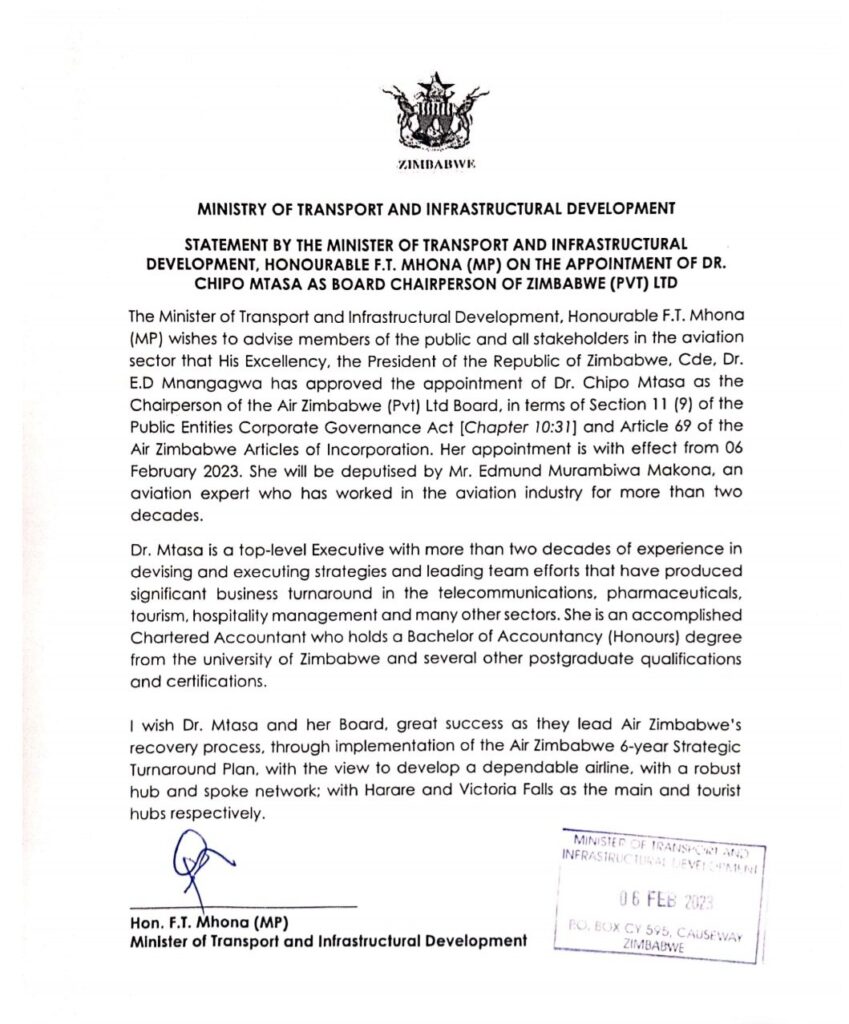 “…the President of the Republic of Zimbabwe, Dr. E.D. Mnangagwa has approved the appointment of Dr. Chipo Mtasa as the Chairperson of the Air Zimbabwe (Pvt) Ltd Board, in terms of Section 11 (9) of the Public Entities Corporate Governance Act [Chapter 10:31] and Article 69 of the Air Zimbabwe Articles of Incorporation. Her appointment is with immediate effect, from 6 February 2023,” he said in a statement.