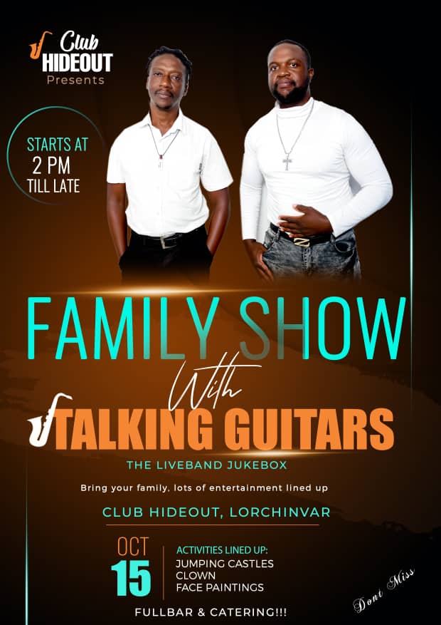 Don’t miss out tomorrow’s Family Show with Talking Guitars the Liveband Jukebox at Club Hideout, Lochinvar (Southerton) from 2pm till late. Jumping castles, clown and face painting available.