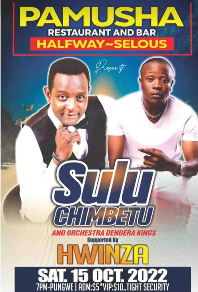 Dendera singer Suluman Chimbetu and the Dendera Kings will be back-to-back with Zim dancehall chanter Hwinza this Saturday at Pamusha Restaurant and Bar in Selous (Halfway) from 7pm till pungwe. Admission: $5, VIP: $10.