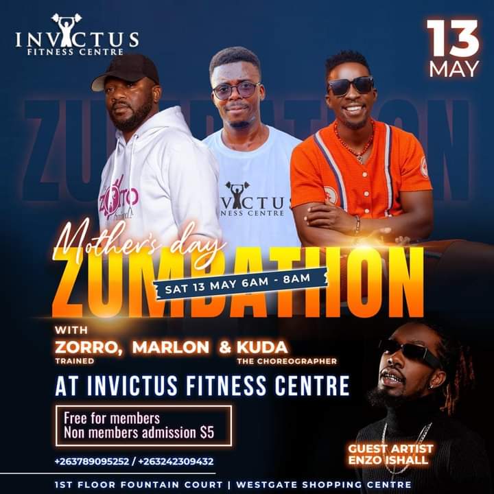 As the nation celebrates Mother’s day, join talented Zim dancehall artist, Enzo Ishall as a guest artist at Invictus Fitness Centre at Westgate Shopping centre for a “Mother’s Day Zumbathon”. He will be joined by fitness trainer Zorro, Marlon and Kuda the choreographer from 6am to 8am. The event will be hosted at 1st floor Fountain Court. Admission: Free for members and $5 for non-members.